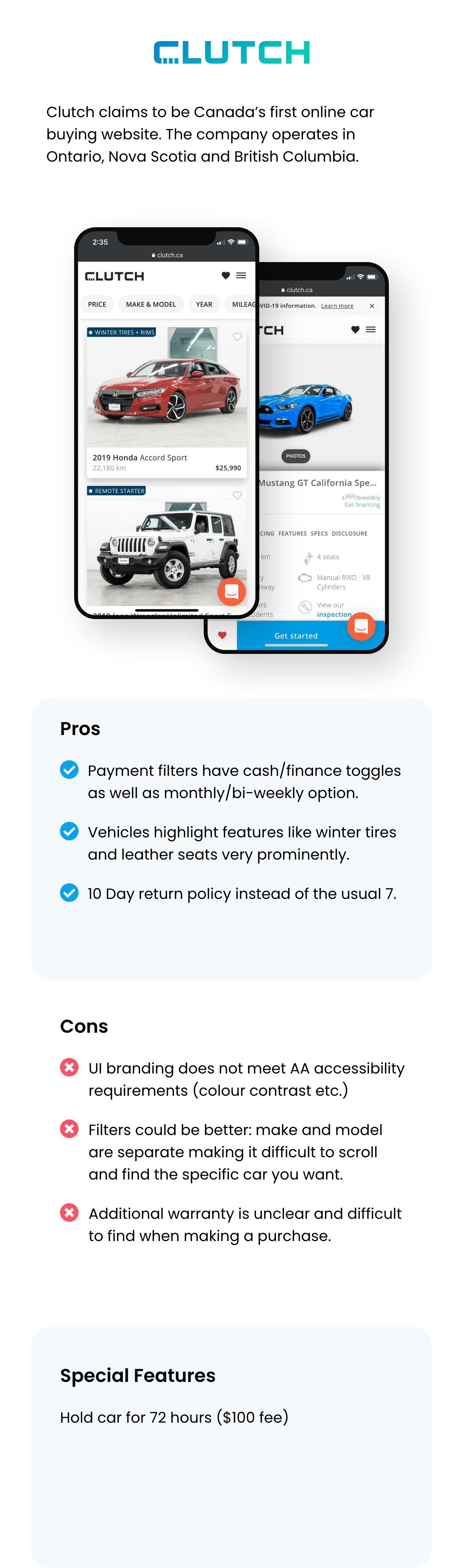 After gathering feedback from our competitor testing, I updated our version 2 mockups and created working prototypes for users to test. Here is a brief example of our findings from one of our prototype tests where we compared our version 2 product page with Carvana’s (US competitor).