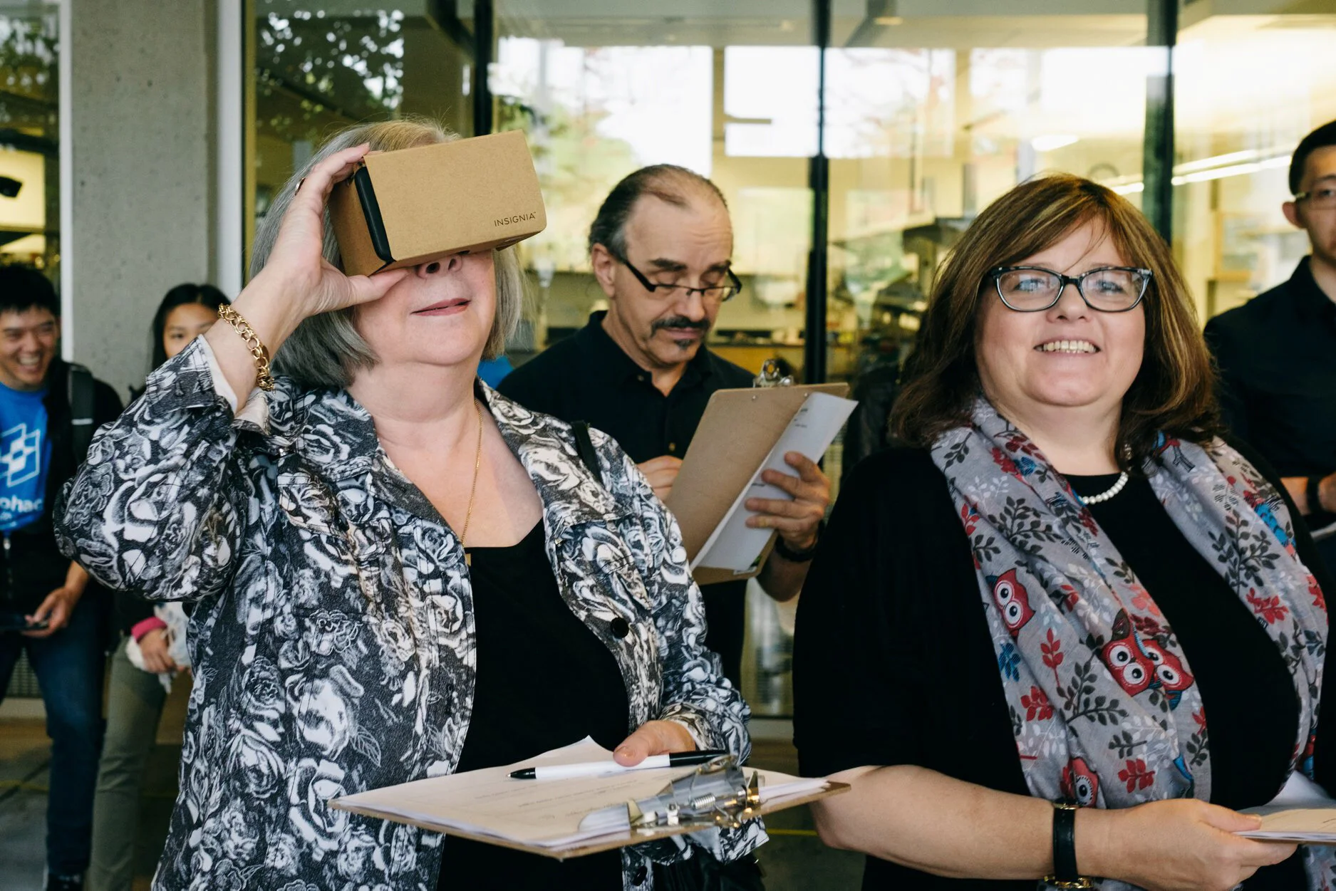 After pressing the "play" button, the screen prompts users to rotate their screen and insert their devices into a virtual-reality headset such as a Google Cardboard or Google Daydream (shown below).
