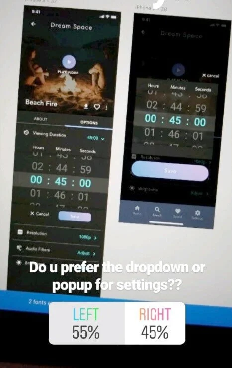 We had only 24 hours to finish our application and present to the judges; therefore, we had limited time to test. We could only ask our friends and family for their input on our design decisions. Below are two voting sessions we did on instagram regarding our video player.