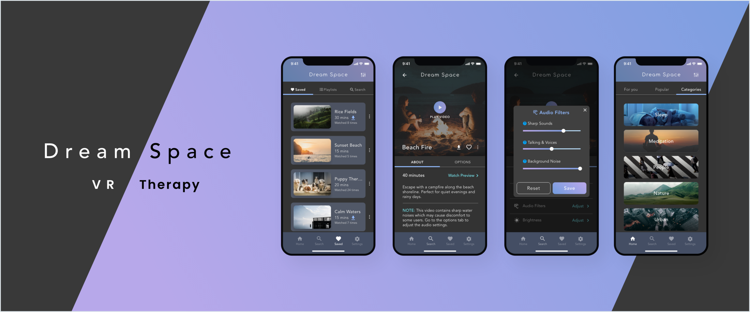 Our initial goal was to provide first-responders and veterans with a product to relax their mind from their professions and substitute unhealthy coping habits. Dream Space allows everyone from first-responders to college students to enjoy therapeutic virtual reality experiences and relax their mind.